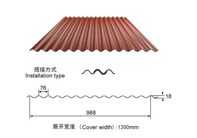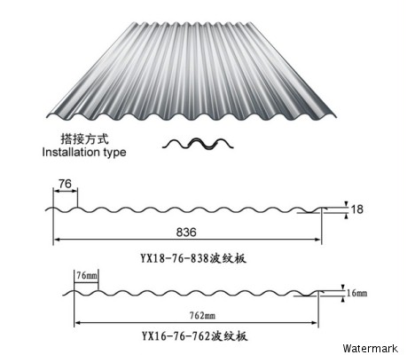 YX18-76-836 YX18-76-988 YX16-838(水波纹)板型是腾威彩钢公司推出的产品,其流畅的小波纹外形,造型美观大方,能满足多种建筑风格,轻质,耐用,安装方便快捷。本公司可生产多种材质(镀锌,彩涂,铝合金,不锈钢)曲面波纹板可采用具有多种颜色选择,安装快捷简便,是经济实用的屋面和墙面围护系统,可以做墙面横铺板具有很好的装饰效果。