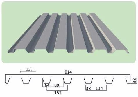 YX38-152-914开口压型钢板,它的肋高为38mm,由6个波组成,每个波距为152mm,整板宽度为914mm,它的展开宽度为1250mm,既可作为屋面底板/墙面板,也可作为楼层模板使用,施工非常便捷,完工后效果美观。